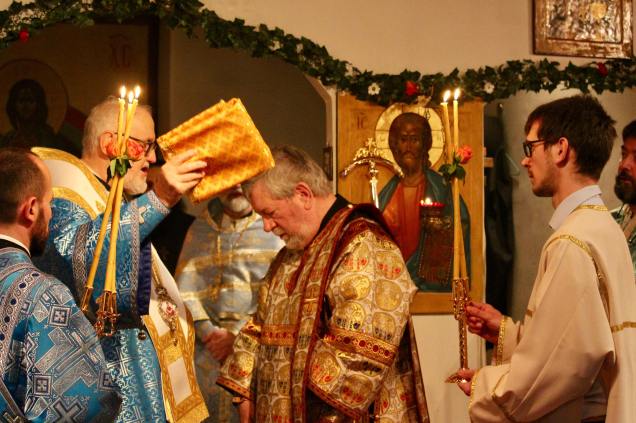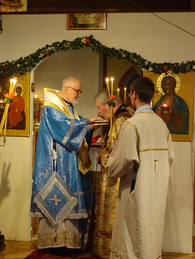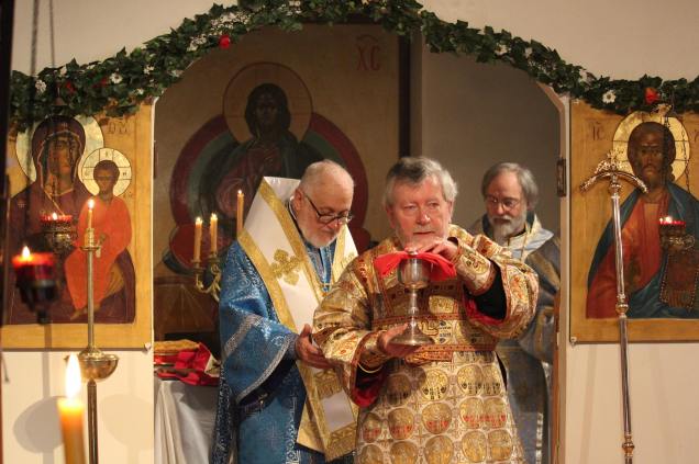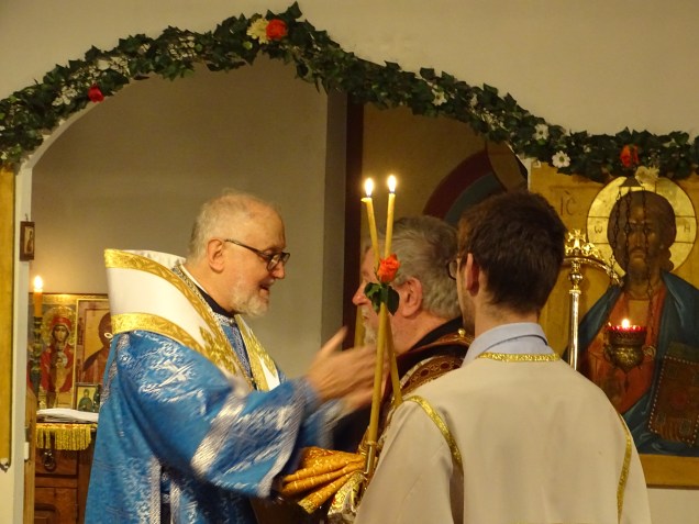 La paroisse saint Jean de Cronstadt & saint Nectaire d’Egine à Rennes a eu la joie d’accueillir, dimanche 3 juin, la rencontre annuelle de la Fraternité Orthodoxe de l’Ouest. La veille, la célébration des vêpres, avec Père Jean-Michel Sonnier, précédée d’un pannykhide pour le Père Jean Roberti, assurée par Père Yannick Provost qui lui a succédé à Rennes, rassemblait les premiers arrivés des fidèles de Caen, Tours, Angers, Le Mans. Le lendemain, c’est une assemblée plus nombreuse qui participait à la divine liturgie pour la fête de Tous les Saints, célébration présidée par le Père Syméon Cossec, higoumène du monastère saint Silouane. Au cours de son homélie, celui-ci expliqua ce que nous pouvions entendre par la notion de sainteté, comment tous nous y sommes appelés par le Christ, et comment nous efforcer de répondre à cette vocation.